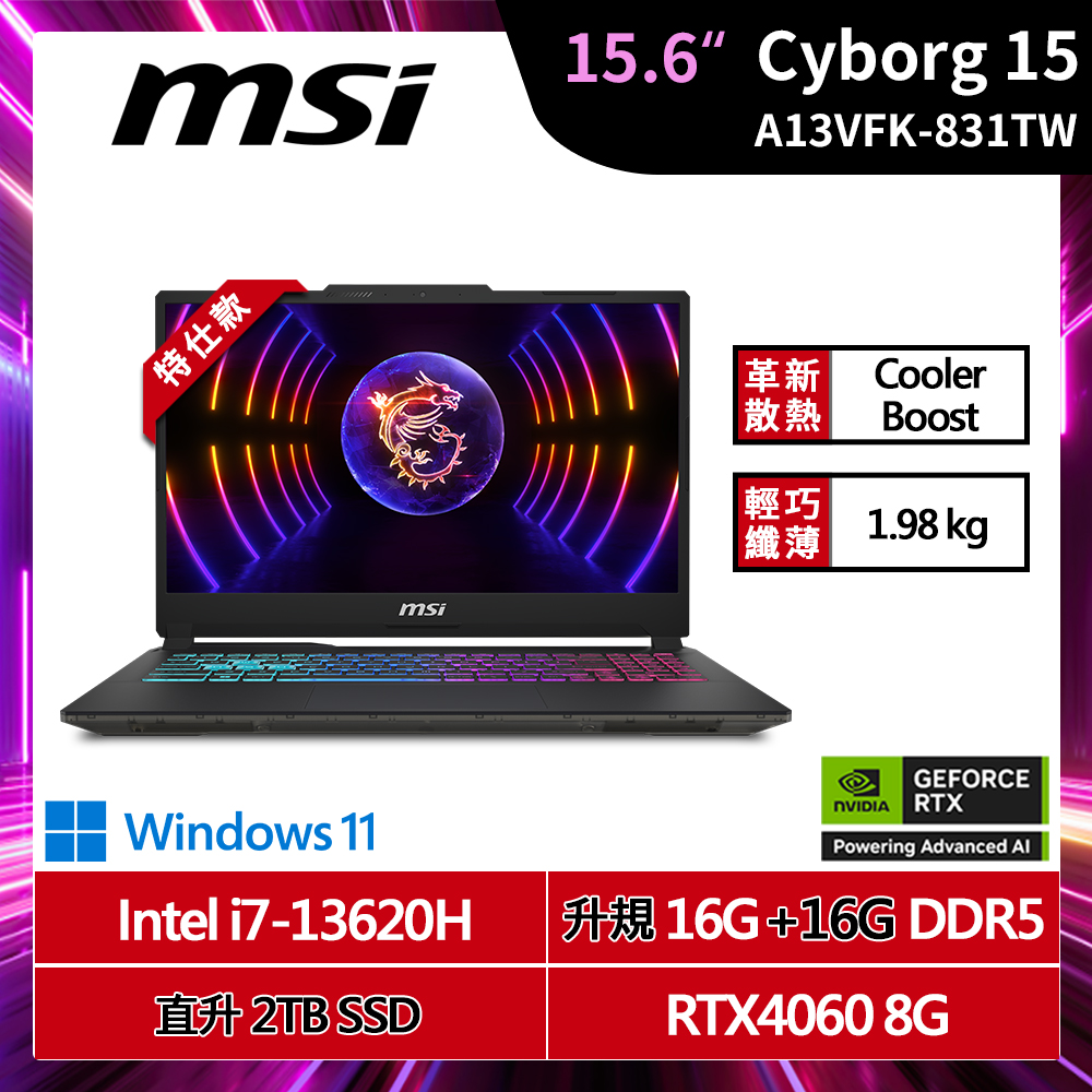 (加裝16G記憶體/直升2TB硬碟)MSI微星 Cyborg 15 A13VFK-831TW 15.6吋 i7 特仕款 電競筆電