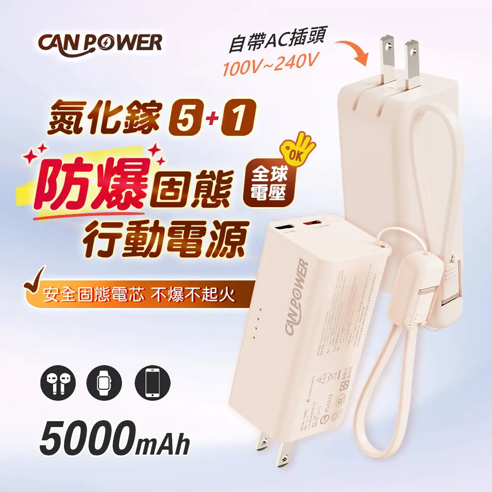 【Canpower】多功能氮化鎵充電器SSB防爆固態行動電源 5000mAh(台灣製造 138g 自帶AC插頭 有wh、ccc標示)