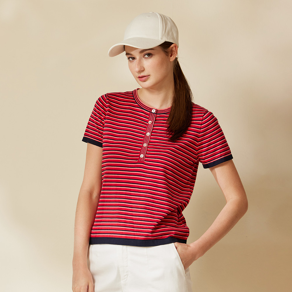 有機棉條紋圓領半開襟POLO針織衫(2色)