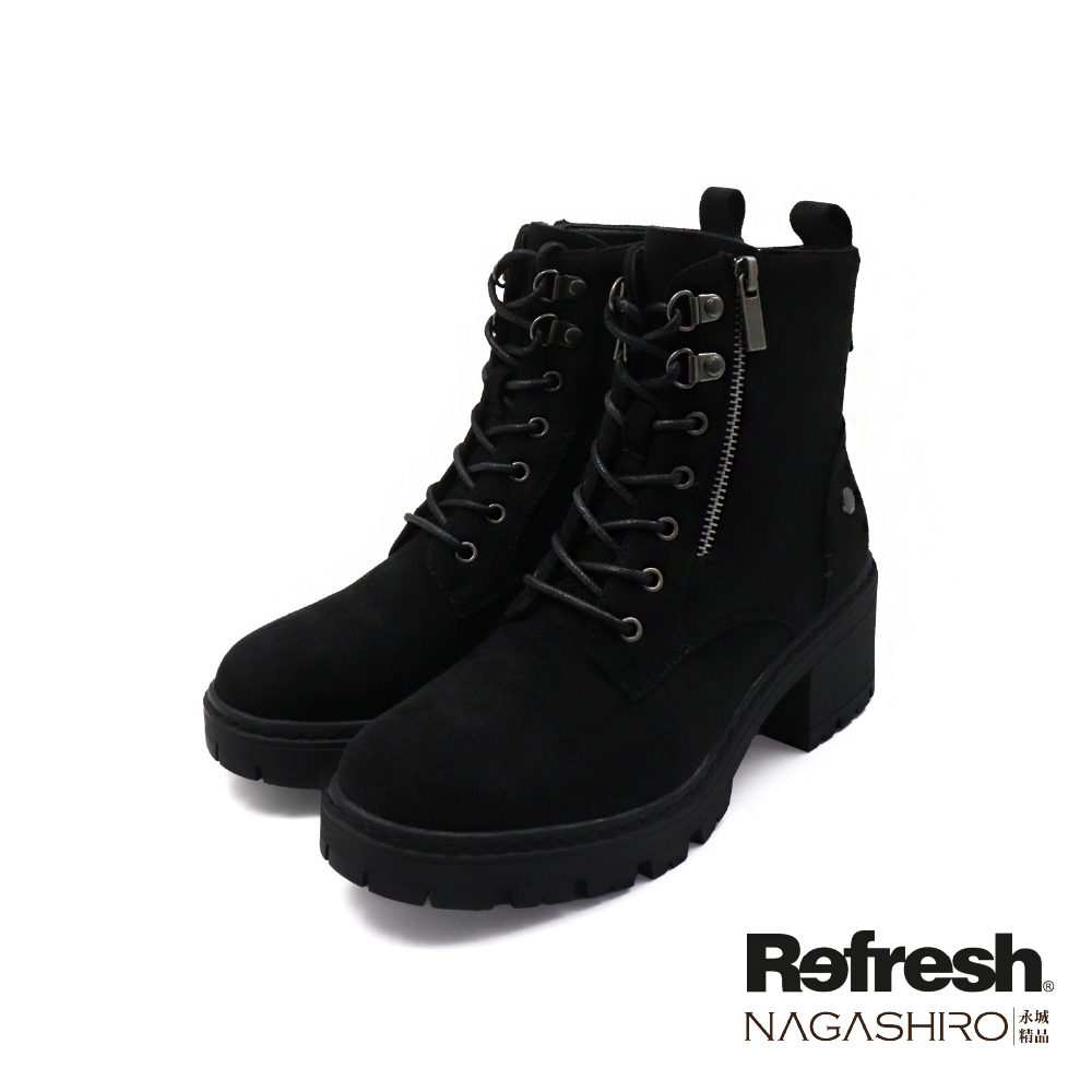 【Refresh】西班牙品牌絨面質感軍工造型粗跟女靴 黑色(173022-BL)