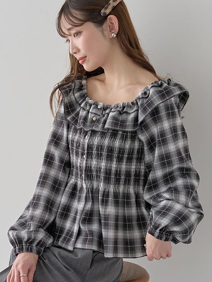 格紋圖案皺褶設計方領襯衫上衣(01001359402) - earth music&ecology