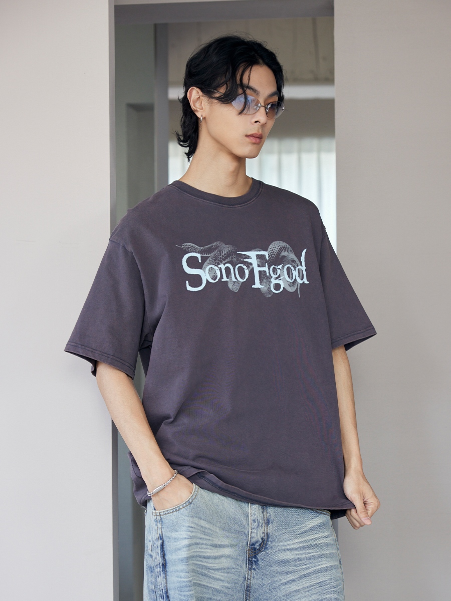 仿舊斑駁蛇年印花水洗短T