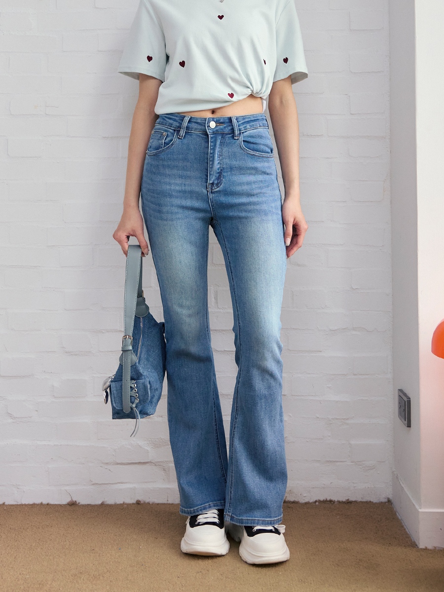 顯瘦刷色牛仔喇叭長褲-藍色