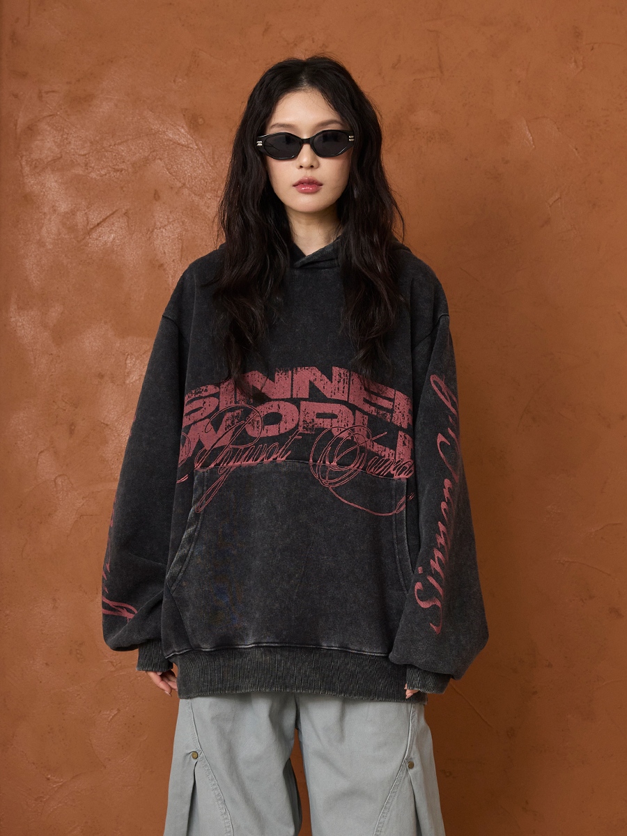 水洗燙印英文字排版長帽T