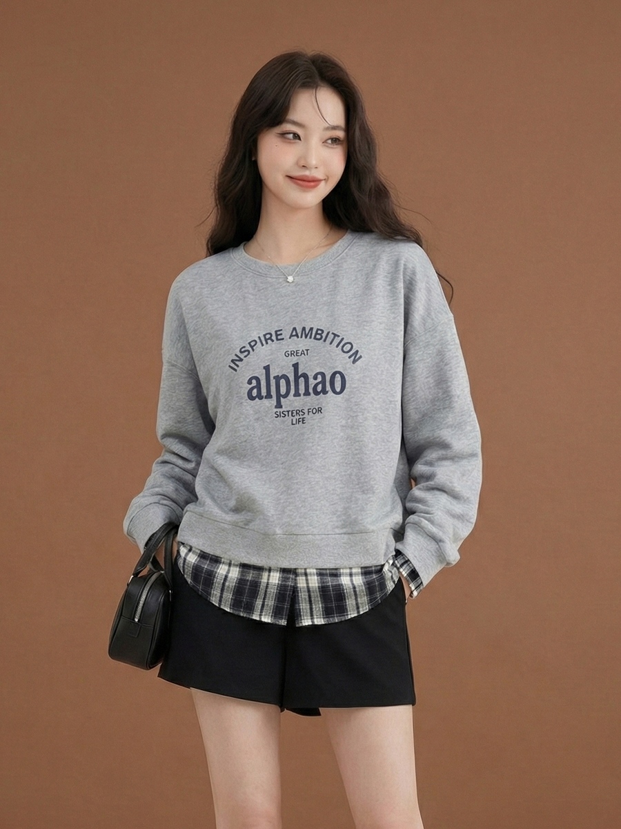 字母印花格紋拼接假兩件上衣