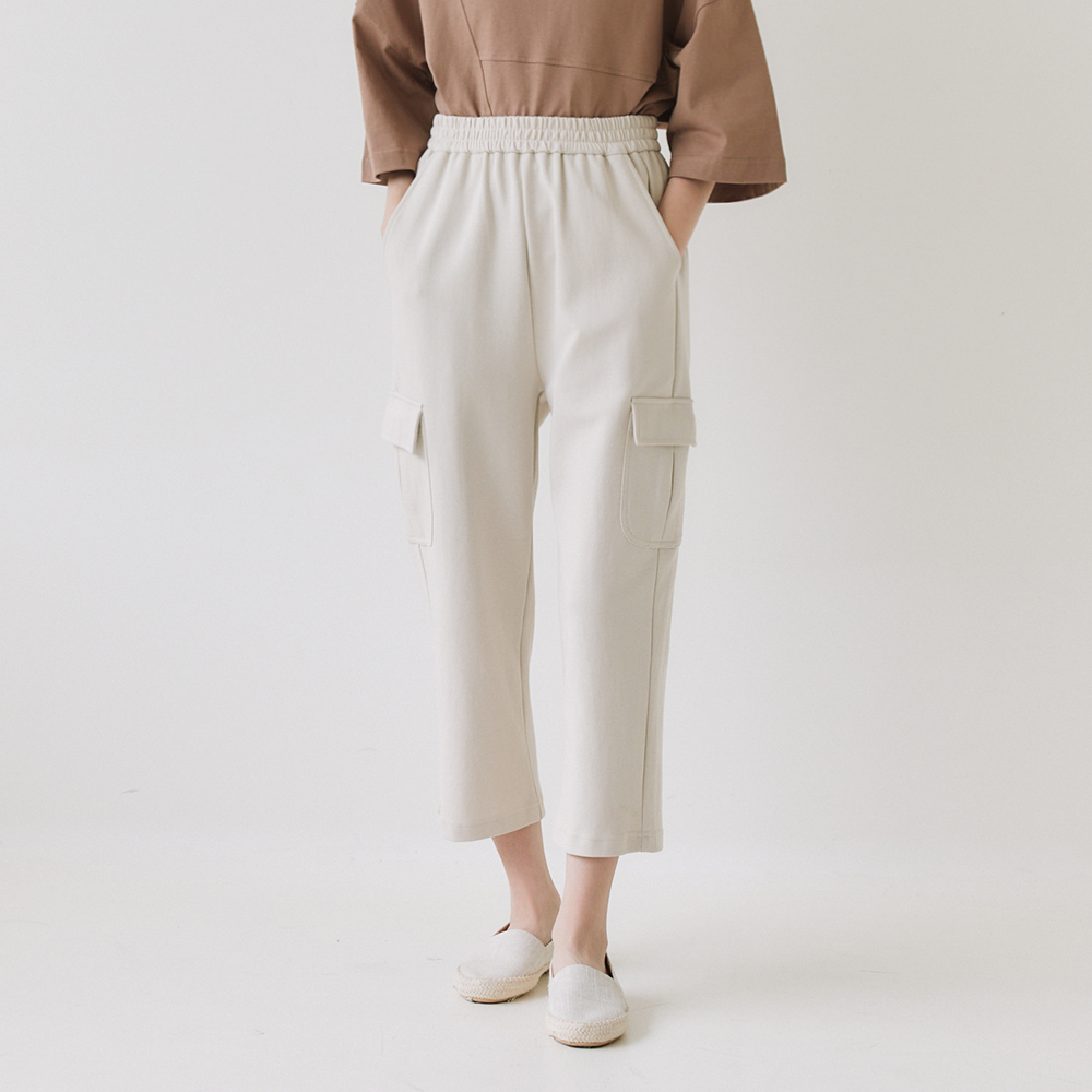 口袋七分棉褲 米白F