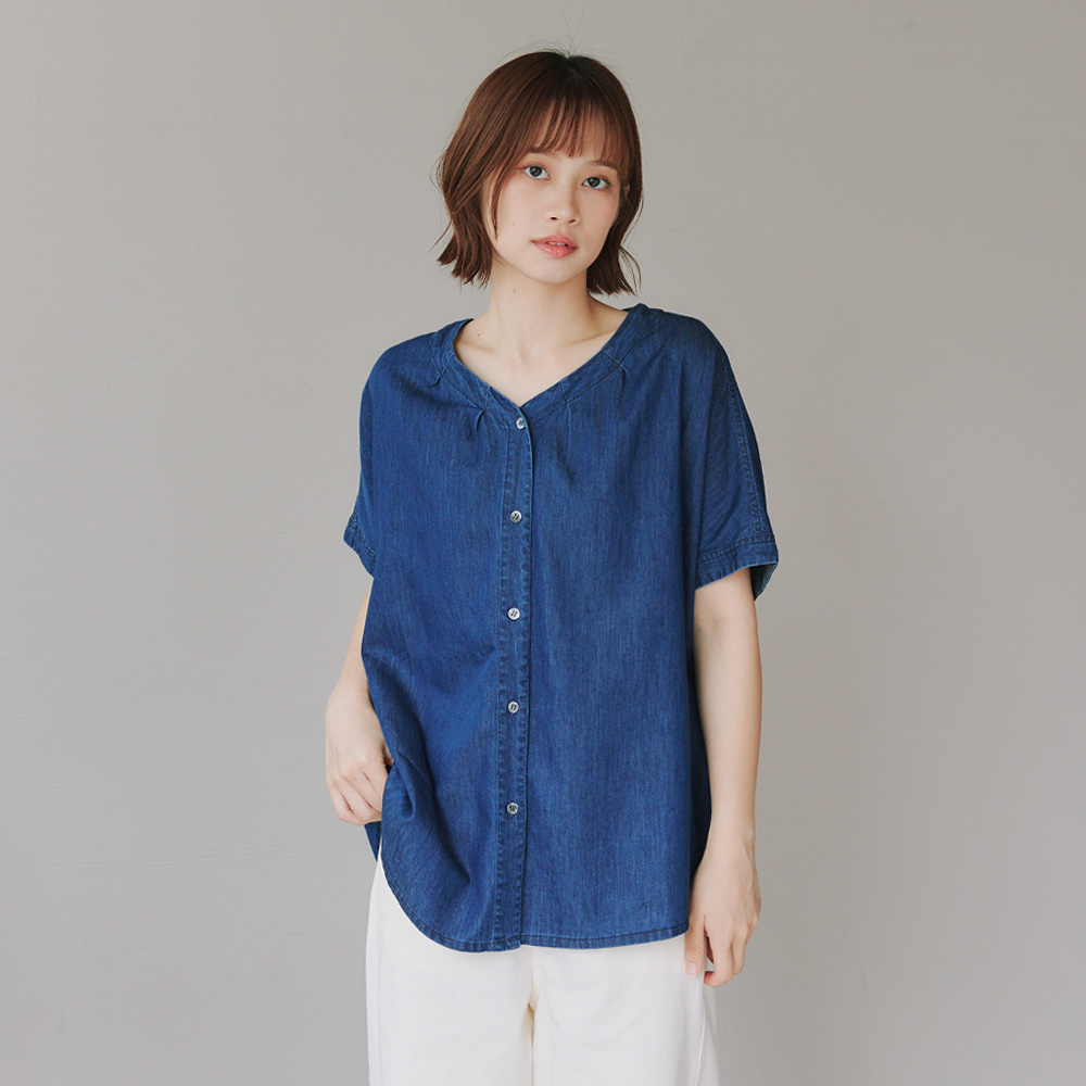 牛仔棉全開襟上衣 深藍F